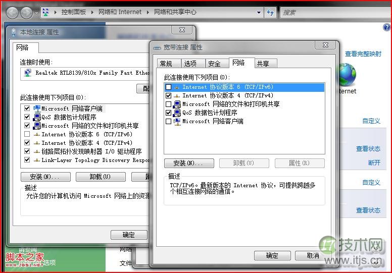 先分别点击宽带和本地的查看状态,反选它们的IPv6选项(如下图),这是出于开机速度上的考虑,要不然每次开机它都自动的获取一遍跟我们一点不沾边的IP段,太浪费时间了.(教育网的源码库就不要关了,其他广大的电信网通用户都应该关闭,这个技术离我们实在太远了)
