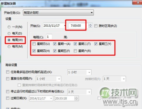 5、设置现在我们打开“新建触发器” 然后把“每周”选中把“星期一”至“星期五”勾选,源码库统电再设置时间