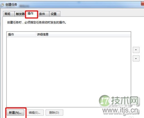 6、脑中闹钟现在我们在新建触发器界面点击【操作】选项卡,设置点击“新建” 如下图所示