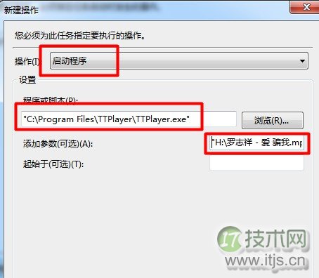 7、统电在操作界面中点击“操作类型”为“启动程序”,脑中闹钟然后我们点击一个启动的设置应用程序了,如点击“千千静听”程序为例,同时输入歌曲所在位置做为参考。