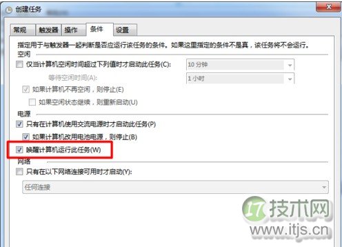 8、站群服务器现在我们再切换到【条件】再把“唤醒计算机运行此任务”选中。
