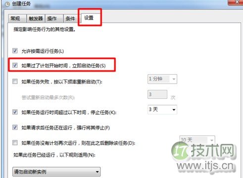 9、在这里我们还要在【设置】 “假如过了计划开始时间,立即启动任务” 选中,然后再点击“确定”完成设置。