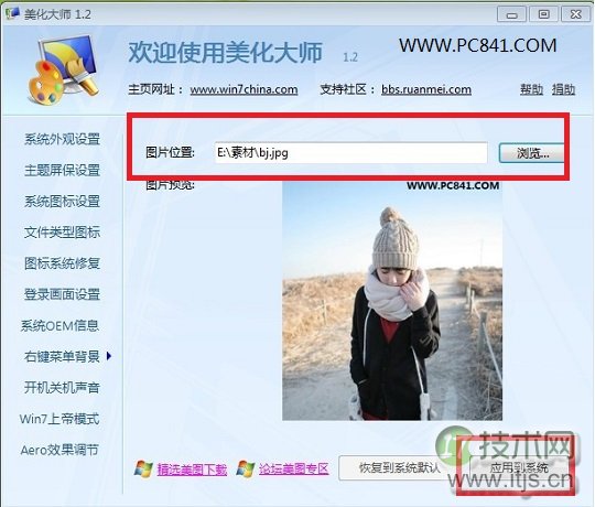 4、进入Windows 7右键菜单设置后,我们即可看到如下操作界面,首先大家要选择一张背景图片,这个图片注意尺寸不要太大了,云服务器提供商最好制作成和右键菜单一张宽的图片最好,以下笔者开始没注意图片有点大,导致设置的不是很好,大家自行后期设置优化下。
