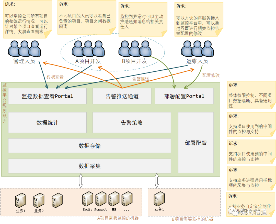 集成数据存储、统计、告警策略、告警推送等能力,业务仅负责埋点数据上报即可。告警能力扩展性强,全业务无差别共享。业务接入简单,但平台实现工作量较大。业务可以有限定制,但是需要基于管理界面上去配置规则,受平台规则支持度限制。先分析下对监控平台的一个整体的诉求情况、以及监控平台需要支持的一些核心业务场景。
