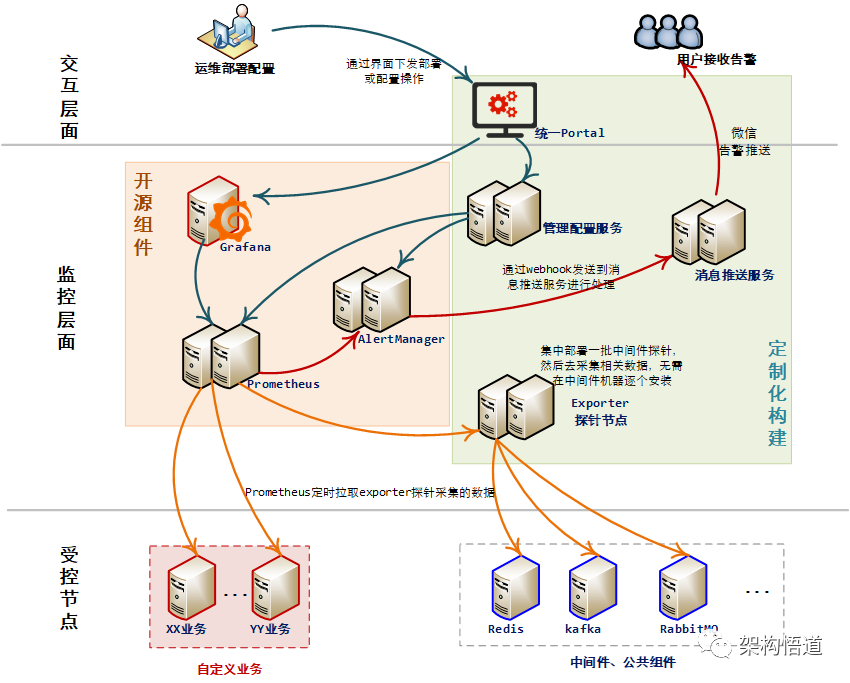 新开发一个webhook告警接收服务,提供rest接口用来接收告警信息;对接收到的告警信息进行处理后,调用当前监控平台提供的微信告警推送接口,推送给用户。4、部署与运维管理策略基于Prometheus的机制,数据上报采用探针的方式暴露相关接口,然后Prometheus定时轮询拉取。