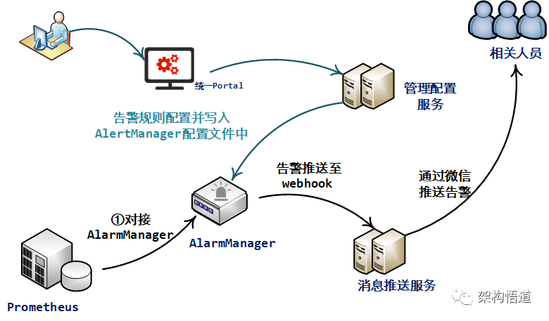所以,从功能与便捷性角度考虑,选定使用AlertManager实现告警能力。作为对其弊端的补偿,规划构建管理配置服务,并在平台统一Portal上提供无门槛易用的配置能力,如下: