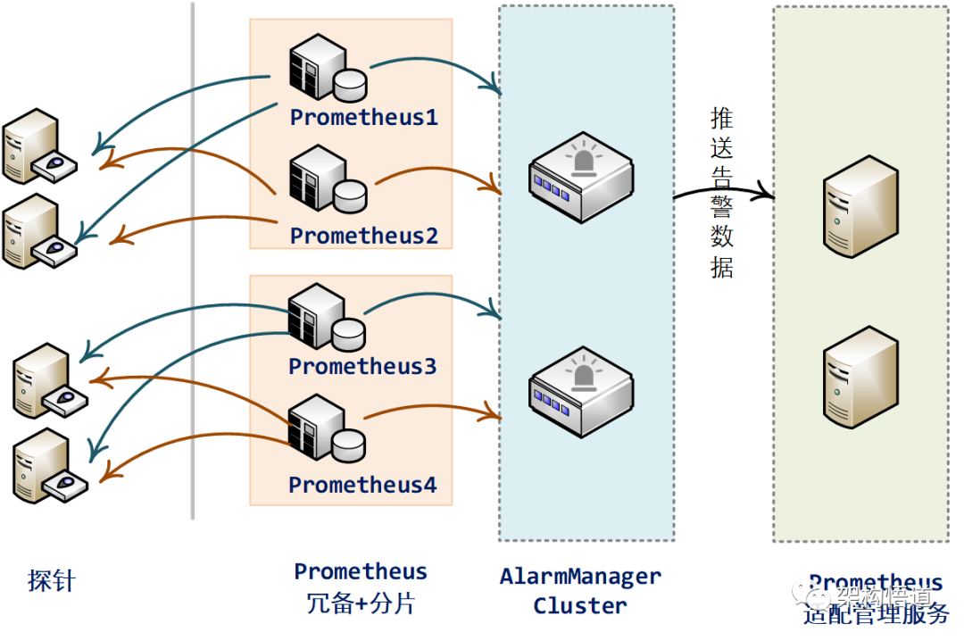 高可用:冗备方案。部署2套prometheus进程,两套prometheus采集相同的探针节点,拥有完全相同的配置数据。可扩展:分片策略。当监控对象数量太多时,将监控对象分片,每个分片部署一套(2个进程)prometheus服务,实现水平无限制扩展。2)AlarmManager