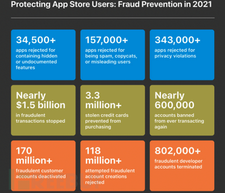 参考文章:https://www.bleepingcomputer.com/news/security/apple-blocked-16-millions-apps-from-defrauding-users-in-2021/