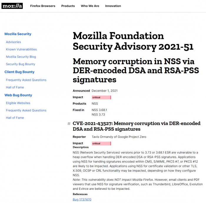 让人松口气的是,Mozilla 声称 CVE-2021-43527 漏洞并未波及 Firefox 网络浏览器。不过所有使用 NSS 进行签名验证的 PDF 阅读器 / 电子邮件客户端,都应该慎重评估。