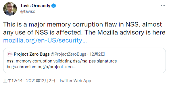 庆幸的是,Mozilla 已在 NSS 3.73 / 3.68.1 ESR 版本中修复了这个 bug 。但未及时打补丁的平台,仍存在程序崩溃、或被攻击者利用于任意代码执行(绕过安全软件)的服务器托管风险。