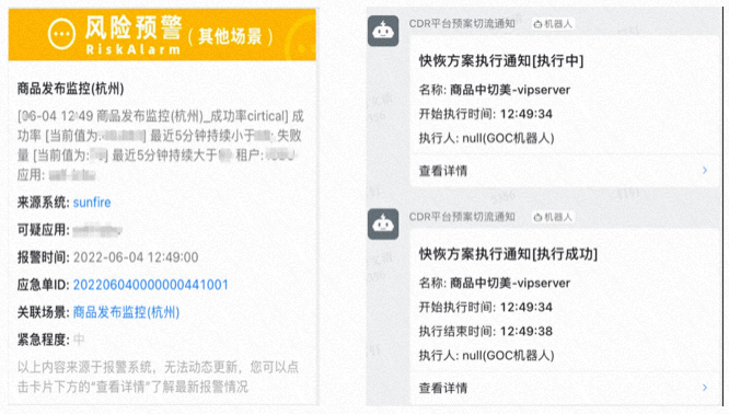 自动化运维管控最好的处理是不需要处理。核心思路是一切操作标准化、流程化、自动化,降低人为干预、提升操作效率。像商品发布/商品管理都有一些自动容灾预案,可以在出现问题时自动快恢。下面的案例是周末出现的一次风险预警就是通过自动执行快恢避免了线上故障的发生。