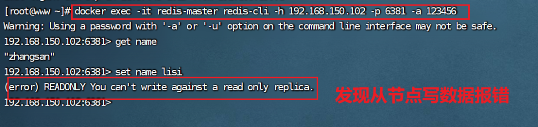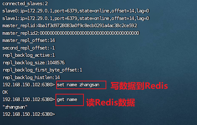 复制docker-compose -f docker-compose-redis-master-slave.yml -p redis up -d1. 1.4.2. 测试1.进入redis-master容器 复制docker exec -it redis-master redis-cli -h 192.168.150.102 -p 6380 -a 1234561. 2.查看集群状态 复制info replication1.