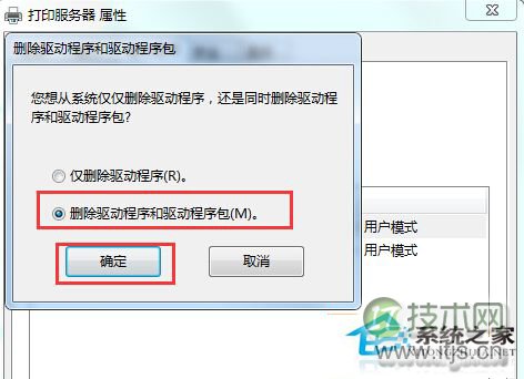 4、在弹出的服务器租用选择窗口中,选择“删除驱动和驱动程序包”,然后点击确定;