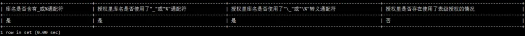 复制SELECT -- 库名是否含有 _ 或 % 通配符 CASE WHEN EXISTS ( SELECT 1 FROM information_schema.schemata WHERE INSTR(schema_name, _) > 0 OR INSTR(schema_name, %) > 0 ) THEN 是 ELSE 否 END AS 库名是否含有_或%通配符, -- 授权里库名是否使用了 "_" 或 "%" 通配符 CASE WHEN EXISTS ( SELECT 1 FROM mysql.db WHERE (INSTR(Db, _) > 0 OR INSTR(Db, %) > 0) AND (INSTR(Db, \\_) = 0 AND INSTR(Db, \\%) = 0) ) THEN 是 ELSE 否 END AS 授权里库名是否使用了"_"或"%"通配符, -- 授权里库名是否使用了 "\_" 或 "\%" 转义通配符 CASE WHEN EXISTS ( SELECT 1 FROM mysql.db WHERE INSTR(Db, \\_) > 0 OR INSTR(Db, \\%) > 0 ) THEN 是 ELSE 否 END AS 授权里库名是否使用了"\\_"或"\\%"转义通配符, -- 授权里是否存在使用了表级授权的情况(排除指定的两条记录) CASE WHEN EXISTS ( SELECT 1 FROM mysql.tables_priv WHERE NOT ( (Host = localhost AND Db = mysql AND User = mysql.session AND Table_name = user) OR (Host = localhost AND Db = sys AND User = mysql.sys AND Table_name = sys_config) ) ) THEN 是 ELSE 否 END AS 授权里是否存在使用了表级授权的情况;1.2.3.4.5.6.7.8.9.10.11.12.13.14.15.16.17.18.19.20.21.22.23.24.25.26.27.28.29.30.31.32.33.34.35.36.37.38.39.40.41.42.43.44.45.