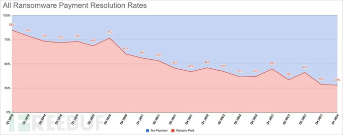 种种原因叠加在一起,比例很多勒索软件受害者选择拒绝支付赎金。新低