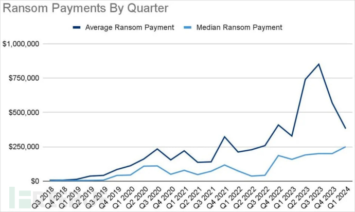 需要注意的是,虽然支付比例以及平均支付金额大幅下降了,但赎金支付中位数环比增长 25%,为 250000 美元,支付给勒索软件团伙的金额比以往任何时候都高,根据 Chainalysis 的一份报告,2023 年达到 11 亿美元。