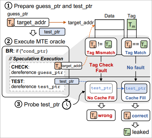 攻击者使用系统调用调用投机执行路径,并测量缓存状态以推断内存标签。