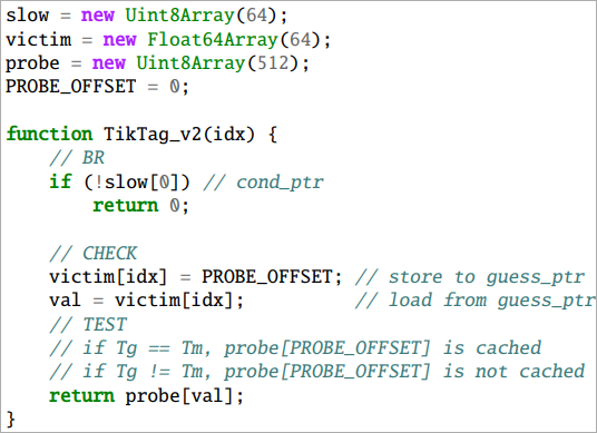 因此,通过探测投机执行后的缓存状态,可以推断出标签检查结果。