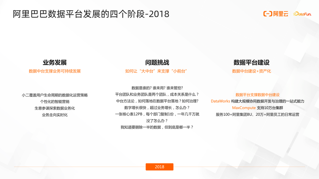 随着计算和数据的不断增长,数据治理问题凸显,阿里巴巴开始思考如何将数据中台的方法论落地平台层,让平台可以更好的支持中台的建设。在数据平台侧,MaxCompute 达到了10万台集群规模,DataWorks构建大规模协同数据开发与治理的一站式能力,服务100+阿里集团BU、20万+阿里员工的取数用数需求。