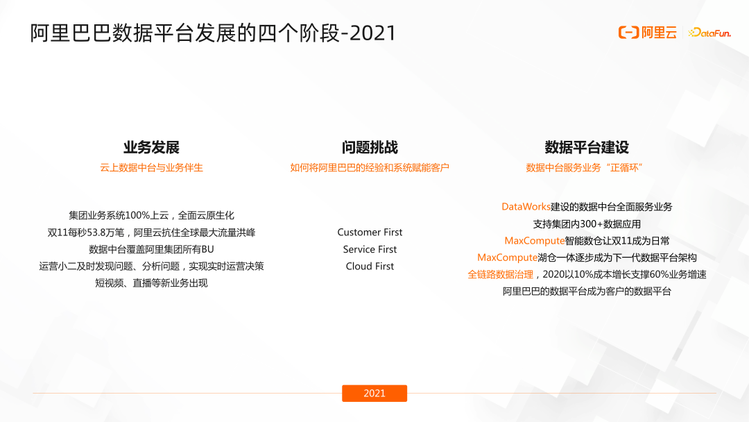2018年至2021年我们称之为云上数据中台与业务伴生的阶段,2018年后阿里的数据平台业务已经很成熟了,数据中台达到了一个正循环,可视为数据中台建设成功的标志。DataWorks支撑建设的数据中台全面服务业务、支持集团内300+数据应用、MaxCompute智能数仓让双11成为日常,目前已能够以一个比较低的成本实现支持业务的快速增长。