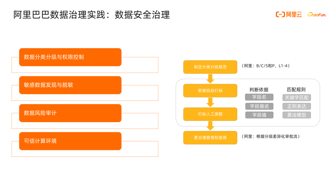 第三个阶段,数据安全治理。当前,数据安全已被提高到国家和社会的层面。数据安全治理主要从数据分类分级与权限控制、敏感数据发现与脱敏、数据风险审计、可信计算环境四个方面进行。这里主要提一下数据分类分级,我们支持数据自动打标(如通过血缘关系等),特殊的数据可由人工打标调整,然后基于不同标签对数据进行更合理管控和使用。