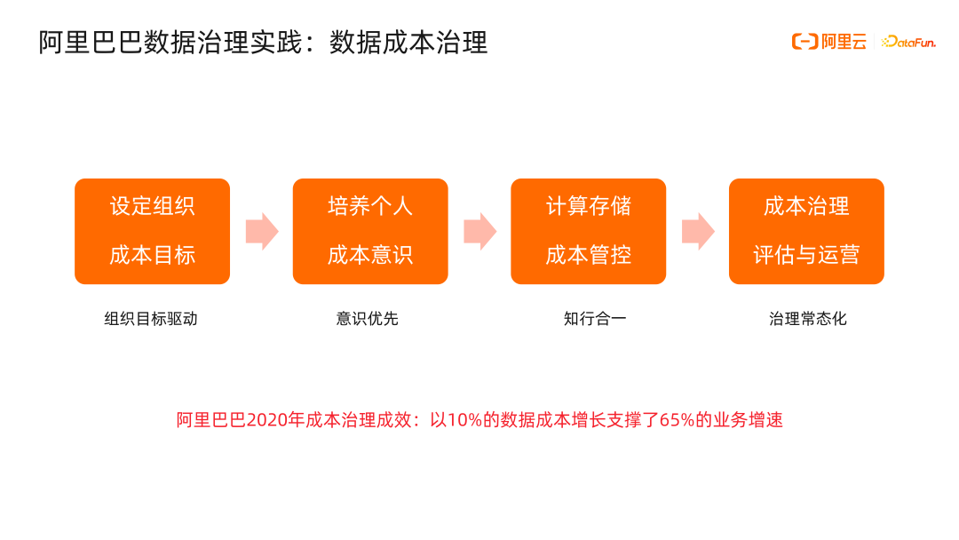 第四个阶段,数据成本治理,这也是阿里巴巴近几年在持续做的事情。阿里做成本治理为四个步骤,即设定组织成本目标、培养个人成本意识(有工具督促)、计算存储成本并管控、成本治理评估与运营。阿里巴巴2020年成本治理成效显著,以10%的数据成本增长支撑了65%的业务增速。