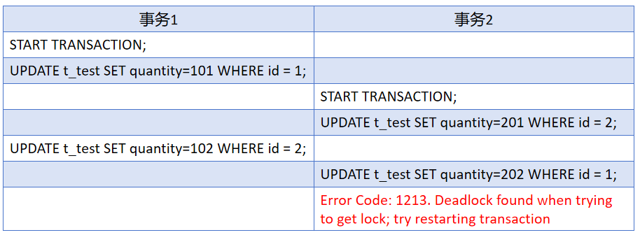 复制CREATE TABLE `t_test` ( `id` int(11) NOT NULL AUTO_INCREMENT,聊聊 `quantity` int(2) DEFAULT NULL, PRIMARY KEY (`id`) ) ENGINE=InnoDB DEFAULT CHARSET=utf8mb4;1.2.3.4.5. 复制INSERT INTO `t_test` VALUES (1, 1); INSERT INTO `t_test` VALUES (2, 2);1.2.如果有两个事务更新表中id等于1和2的数据,但更新的顺序相反,像下面这样,亿华云就会出现死锁: