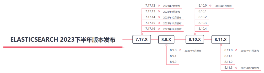 Elasticsearch在2023年下半年发布了三个大版本,8.9.x、8.10.x、8.11.x,带来了诸多的新功能特性,在每个大版本之间也包括几个小版本,解决一些问题修复。除了发布主流新版本之外,Elasticsearch依然发布了多个7.17.x持续更新版本,主要侧重对已知问题的修复,也包括支持与8.x版本兼容性过渡。