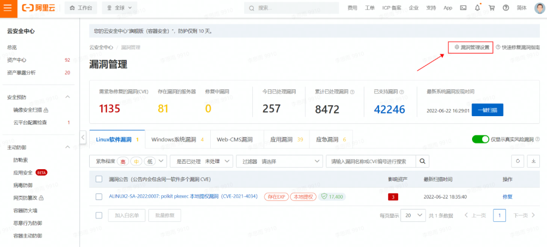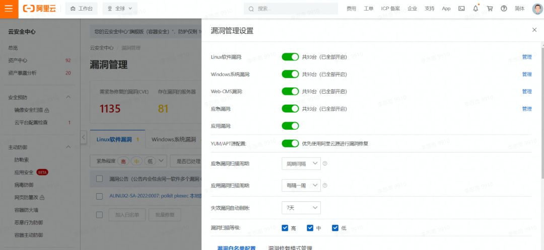 云安全中心支持对主流漏洞类型进行检测并提供一键修复功能: