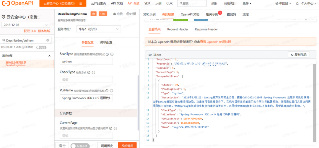 (1)扫描获取特定应急漏洞的名称信息https://help.aliyun.com/document_detail/421691.html示例:扫描Spring Framework JDK >= 9 远程代码执行漏洞 。
