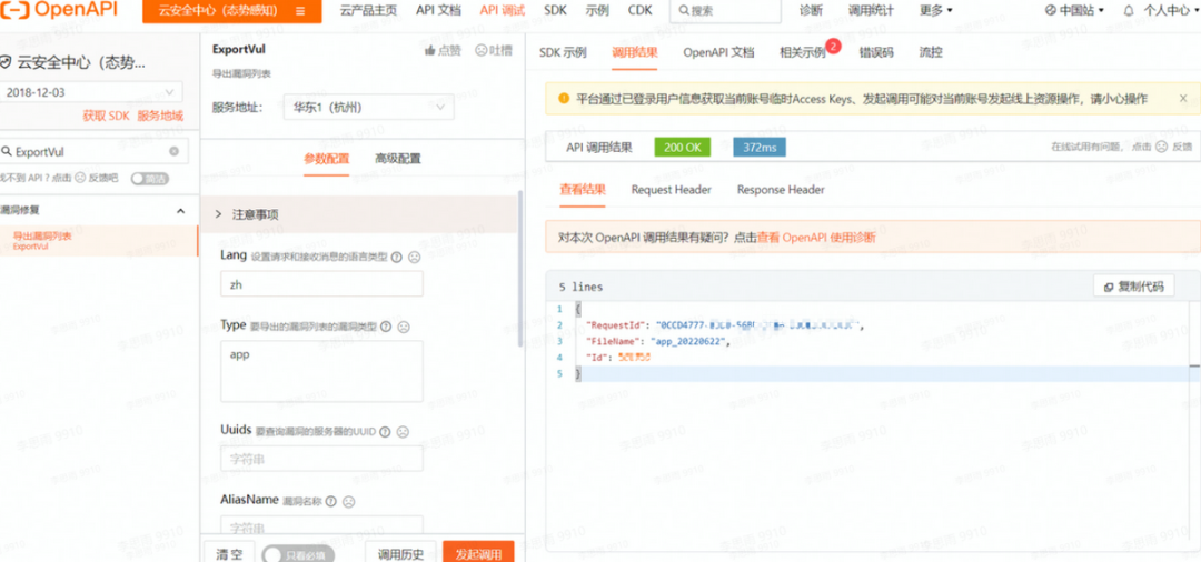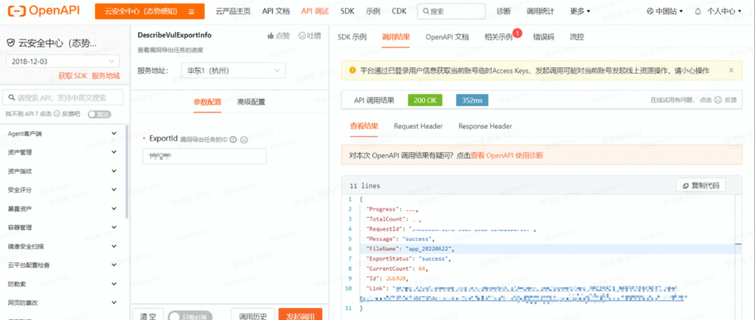 "Count": 1}1.2.3.4.5.6.7.8.9.10.11.12. (3)导出漏洞列表&查看漏洞导出任务的进度https://help.aliyun.com/document_detail/421868.html#api-detail-0https://help.aliyun.com/document_detail/421867.htmlExportVul接口用于导出漏洞列表,与DescribeVulExportInfo接口配合使用。使用ExportVul接口建立漏洞导出任务之后,可调用DescribeVulExportInfo接口录入漏洞导出任务的ID,查看漏洞导出任务的进度。
