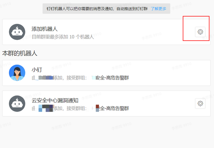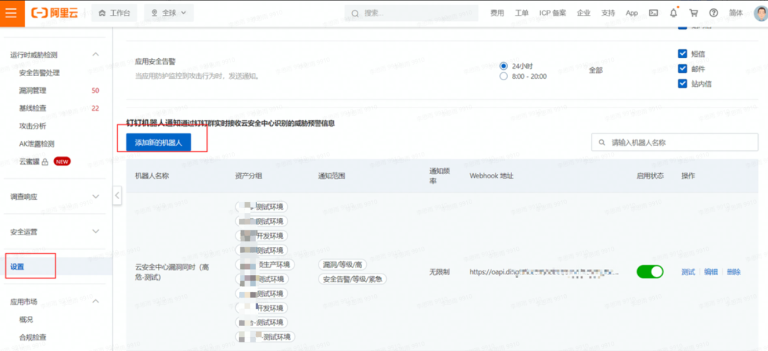 在云安全中心-设置-通知中可以添加钉钉告警机器人,根据资产分组或通知范围设置告警;webhook地址在添加钉群自定义机器人后生成 。