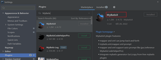 在使用前我们需要在插件市场中搜索并安装MyBatisX插件。