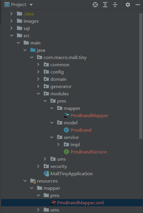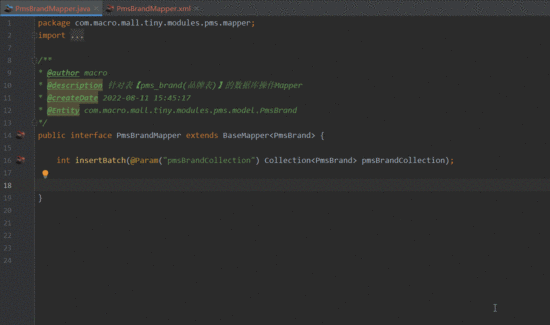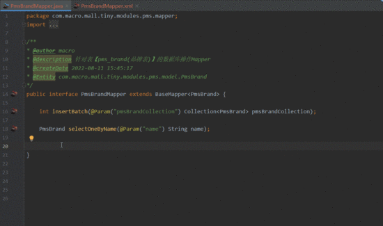 支持mapper.xml和Mapper接口之间方法的互相导航跳转;内置代码生成器,通过使用GUI的实现试试形式,能根据数据库来生成Domain、插成代mapper.xml、吧键生Mapper、提示太全Service和Service实现类代码;可以自定义代码生成器模板;可以通过类似JPA的方式,直接根据方法名称在mapper.xml中生成查询实现,同时支持提示。接下来介绍下MybatisX的使用,这里以我的脚手架项目mall-tiny为例。