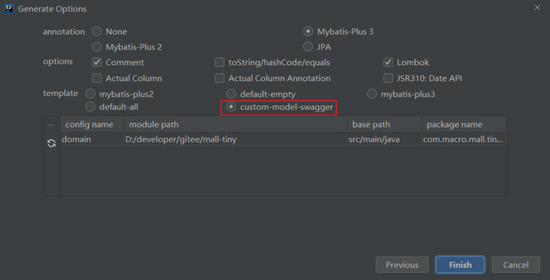 </#list>}1.2.3.4.5.6.7.8.9.10.11.12.13.14.15.16.17.18.19.20.21.22.23.24.25.26.27. 然后再运行代码生成器,选择只生成带Swagger注解的实体类;