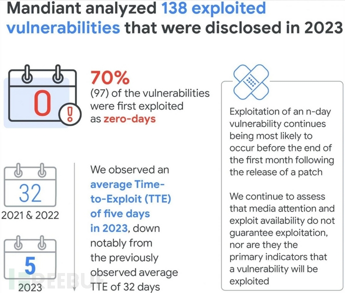 谷歌Mandiant安全分析师警告称,谷歌攻击者发现和利用软件零日漏洞的年被能力增长已成为一个令人担忧的新趋势。在2023年披露的利用138个被积极利用的漏洞中,有97个(70.3%)是漏洞0 Day漏洞,意味着大量漏洞在被供应商知道或修补之前就被攻击者用来实施攻击。谷歌