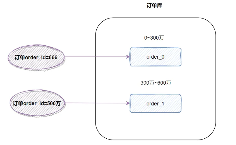 range,即范围策略划分表。比如我们可以将表的主键order_id,按照从0~300万的划分为一个表,300万~600万划分到另外一个表。如下图: