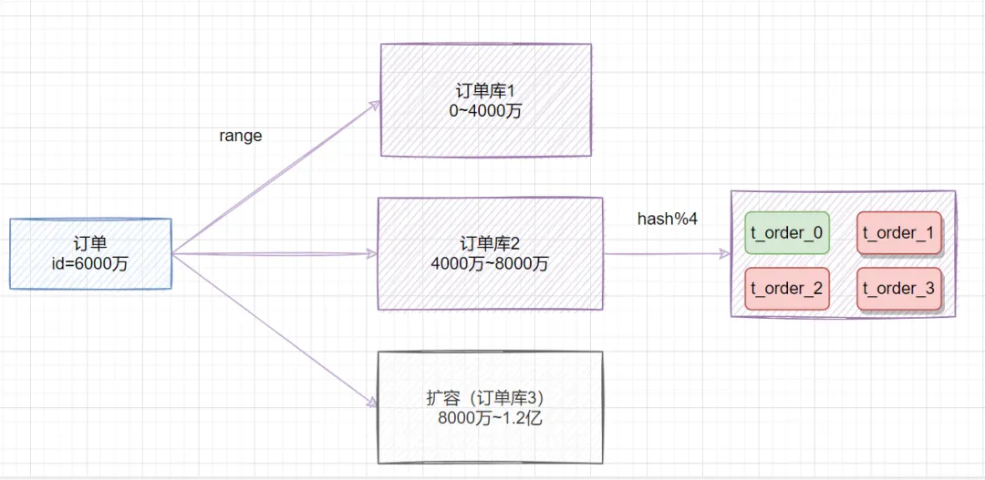 在拆分库的时候,我们可以先用range范围方案,比如订单id在0~4000万的区间,划分为订单库1;id在4000万~8000万的数据,划分到订单库2,将来要扩容时,id在8000万~1.2亿的数据,划分到订单库3。然后订单库内,再用hash取模的策略,把不同订单划分到不同的表。