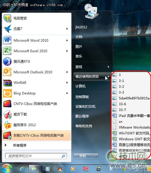 Windows 7在运行的时候,会把用户最近使用过的程序显示在开始菜单中,用户点击开始菜单后,就会看到各种应用程序的图标,方便清楚的了解到最近使用过何种程序。而在有些程序图标的右边会有一个黑色的箭头,表示着该程序最近打开了一些文件,而用户则可以通过点击这个黑色的箭头来了解最近打开了哪些文件。如图所示,在这个WinRAR解压程序的右边,详细的显示出了最近打开的文件,而假如想要删除其中的某一个记录,只需要右键单击对应的文件名字,在弹出的菜单中单击“从列表中删除”项,即可完成对该记录的删除操作了。 【文章摘要】尽管Windows 7系统以智能化、易操作、IT技术网安全稳定等备受欢迎,但直到现在很多人已经养成了使用很长时间都不整理磁盘和系统的习惯,以至于久而久之,系统变得越来越慢,并且容易出现故障,而另一个不好的习惯就是电脑上保存了大量的文件,有些是甚至是具有隐私性的文件          从“最近使用的项目”中删除            除了以上两种在应用程序的记录中删除对应的项以外,在开始菜单中还有一个“最近使用的项目”这个按钮,和上面两种方法略有区别,在这个“最近使用的项目”中显示的是电脑中最近打开的所有文件的记录。