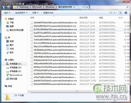 上面介绍的三种清除使用记录的方法都是在常见的界面操作下完成的,而在Windows 7中,还有一个被系统“隐藏”起来的“最近使用项目”的文件夹,这个文件夹中同样记录了使用了文件的历史记录,但是这个文件夹隐藏的较深,一般的用户都不会发现。            打开的方法是在Windows 7资源管理器的地址栏中输入它的相关路径(%APPDATA%MicrosoftwinRecentAutomaticDestinations),然后按回车键,就进入了这个文件夹。不过在这个文件夹中,每个应用程序都适用了不同的编码,假如只看名字的话是分辨不出来的,假如想要知道是什么程序,可以选中对应的文件,右键单击打开“属性”窗口来查看详细信息即可,然后就可以在此进行相应记录的删除了。