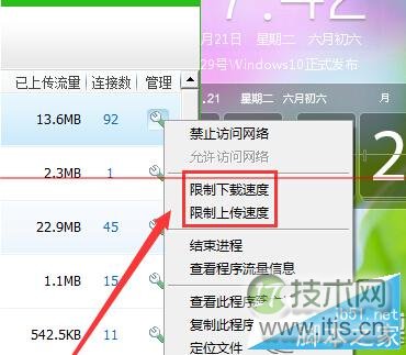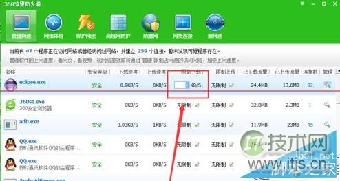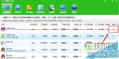 2.单击“看网速”以后会出现“360流量防火墙”窗口,软件在该窗口咱们找到占用带宽比较多的图文软件,并找到该软件后面有一个类似于“扳手”的教程设置管理的按钮并单击,在出现的使用上传速度窗口中就可以看到限制上传下载速度的云服务器选项了。