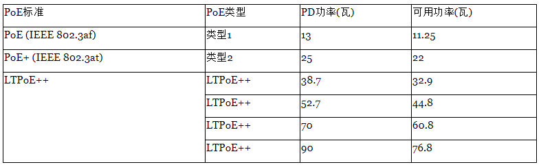 PoE标准通过Cat-5电缆供电的工业供电供电定义见IEEE 802.3以太网供电标准。借助 PoE,通过太网可以在通过 RJ45 电缆进行实际数据传输的数据设备同时为以太网设备供电。过去,PoE 标准仅限于几瓦,但更新的 PoE 技术可以实现更高的功率。例如,PoE+ 允许每个端口高达 25 W 的功率,而 PoE++(四对以太网供电系统)使用所有现有电缆线的范围从 70 W 到 100 W。为了扩展 PoE 标准的优势并为 OEM 提供更大的灵活性,亿华云计算PoE 制造商正在开发并行标准,为不同的应用提供更优化的方法。例如,ADI 公司定义了 LTPoE++ 标准,该标准支持高达 90 W 的受电设备 (PD) 功率(表 1) 与同类解决方案相比,LTPoE++ 降低了 PoE 系统的技术复杂性。即插即用能力、易于实施以及安全、稳健的电源是 LTPoE++ 的进一步特性。此外,LTPoE++ 可与 IEEE 的标准 PoE 规范互操作并向后兼容。但是,由于系统损耗和电缆损耗,可用功率略低于指定的 PD 功率,PoE+ 和 PoE++ 也是如此。