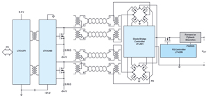 由于 PD 必须根据 IEEE802.3 PoE 规范在其以太网输入上接受任何极性的直流工作电压,因此在 PD 输入之前需要两个二极管电桥。因此,无论使用何种线对,PD 也可以反极性工作。图 2 显示了一个具有集成隔离式开关稳压器的 LTPoE++-、PoE+- 和 PoE-兼容 PD 控制器。像 LT4276 这样的控制器支持正向和反激式拓扑结构,以及 2 W 至 90 W 功率等级的同步操作。低功率等级的传统 PD 控制器具有集成功率 MOSFET,但在更高功率时,可以选择驱动一个外部 MOSFET 使 PD 能够降低其损耗并提高其效率。