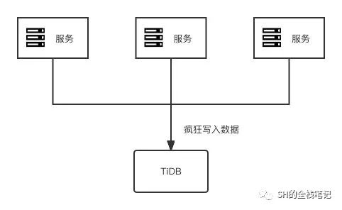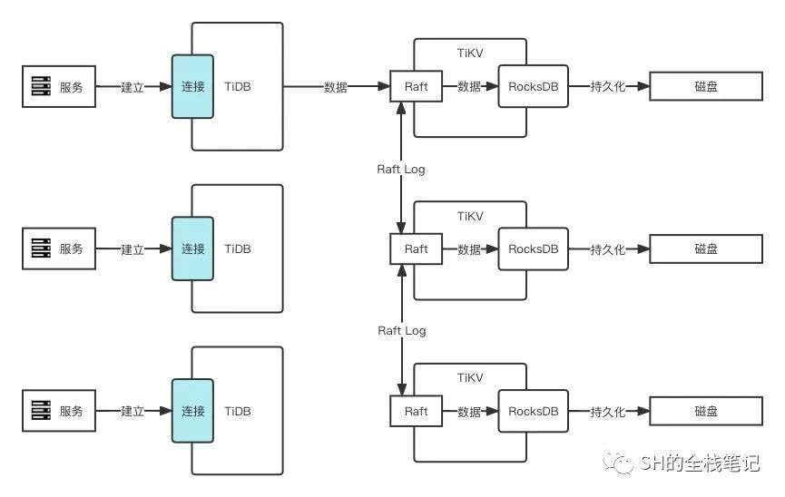 实际情况下,TiDB 的存储节点是单独、分布式部署的,这里只是为了方便理解 TiDB Server 的横向扩展特性,不用纠结,后面会聊到存储
