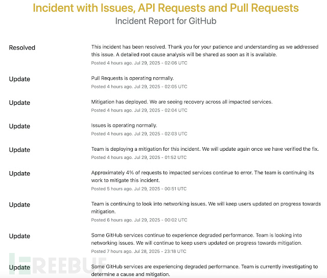 问题解决与后续措施GitHub响应迅速,协调世界时7月29日00:51,团队通报了正在实施的缓解措施,强调仅小部分流量受影响。解决进度随后加快:01:52部署修复方案,监测显示所有受影响区域开始恢复。IT技术网问题跟踪功能于02:03恢复正常,拉取请求功能于02:05恢复,02:06宣布完全解决,GitHub承诺将尽快发布详细根本原因分析。