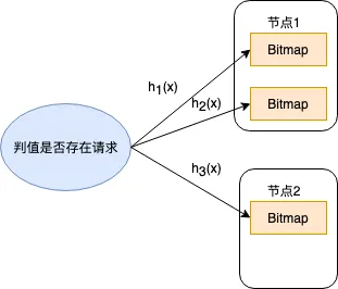 这种场景下,我们就需要对其进行拆分,拆分为足够小的Bitmap,比如将512MB的大Bitmap拆分为1024个512KB的Bitmap。不过拆分的时候需要注意,要将每个key落在一个Bitmap上。有些业务只是把Bitmap 拆开, 但还是当做一个整体的bitmap看, 所以一个 key 还是落在多个 Bitmap 上,这样就有可能导致一个key请求需要查询多个节点、多个Bitmap。如下图,被请求的值被hash到多个Bitmap上,也就是redis的多个key上,这些key还有可能在不同节点上,这样拆分显然大大降低了查询的效率。