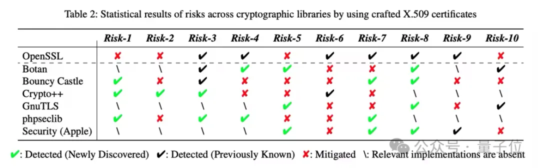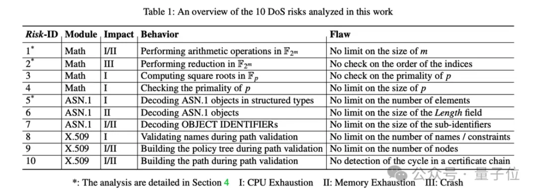 系统性分析与新发现:他们进行了首个针对密码算法库中易受DoS攻击实现的系统性分析工作。在这一过程中,他们发现了三种新的DoS类安全风险,并揭示了一种通用的攻击向量——畸形X.509证书,以利用本研究中总结出的共计10种典型风险所关联的DoS漏洞。