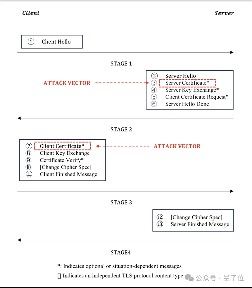 步骤7:攻击者可以饰演一个恶意的客户端,并向服务器发送精心构造的证书或证书链(需开启双向TLS握手)。