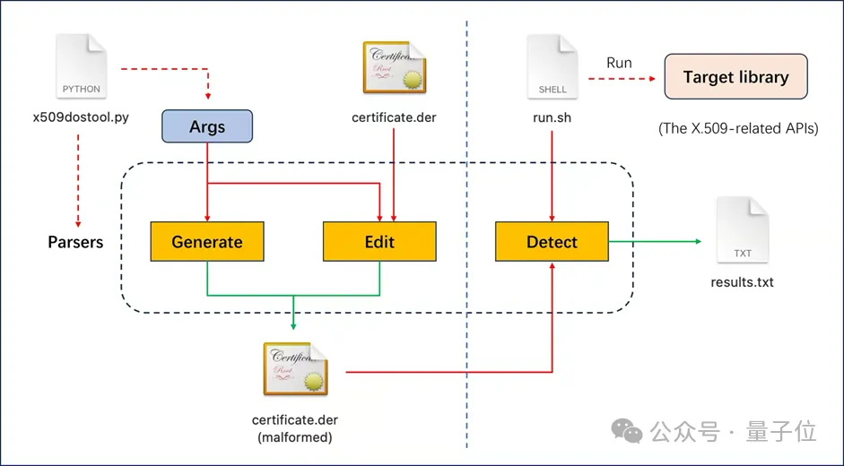 为了更好的辅助使用证书对密码算法库中的实现问题进行检测,研究人员开发了一款名为X.509DoSTool的自动化工具,该工具包含了Generate、Edit和Detect三个子模块,通过根据用户指定的风险类型自动化地生成对应的证书并将其作为输入传入待检测的API中执行,并根据执行结果(如Crash)和监测系统的CPU/内存资源消耗情况来反馈是否存在对应的漏洞,其示意图如图3所示。