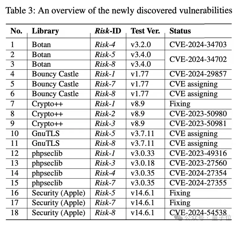 △图4.实验过程中检测出的漏洞信息汇总        此外,为了进一步说明研究人员在威胁模型部分提到的TLS握手和App验签两类威胁模型并展示这些漏洞的实际威胁,他们以在Botan算法库和Apple Security算法库中发现的两个问题(分别为CVE-2024-34703和CVE-2024-54538)为例进行了攻击演示: